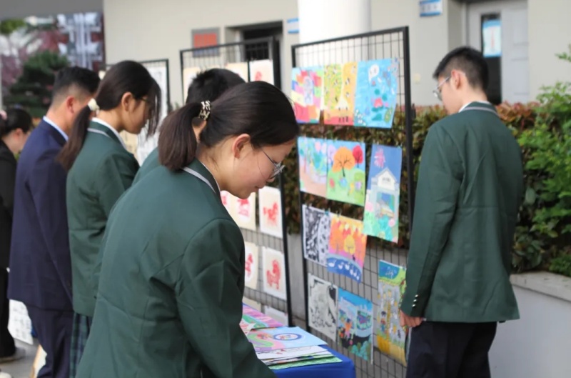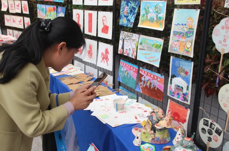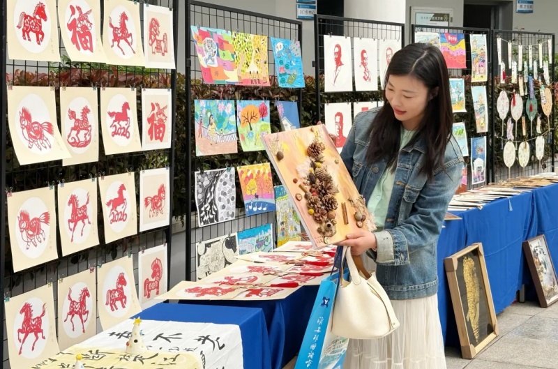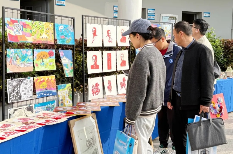 铜像广场上,社团选修课佳作琳琅满目。精巧灵动的传统剪纸、充满奇思妙想的幻想画、创意十足的文创作品依次陈列,笔墨书香与精巧匠心相互交融,尽显学子们的艺术才情与创造能力。银杏大道上,学生们手工绘画和制作的风筝在春风中飘荡,吸引众多师生驻足欣赏。