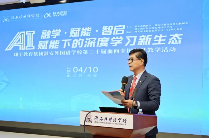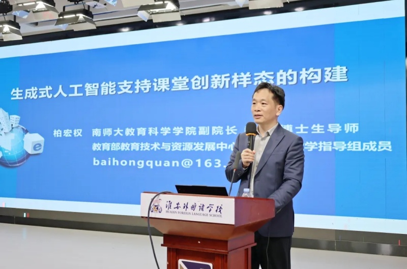 4月10日,淮安外国语学校“融学·赋能·智启”第二十届面向全国公开教学研讨活动暨专家论坛隆重举行。南京师范大学教育科学学院副院长、博士生导师,教育部教育技术与资源发展中心人工智能教学指导组成员柏宏权以《生成式人工智能支持课堂创新样态的构建》为题开设专题讲座。讲座由淮外党支部书记、校长赵树青主持。翔宇教育集团卢志文总校长亲临现场,来自浙江、上海、山东、安徽以及江苏十三大市的各地领导、教师代表齐聚淮外报告厅,共同聆听讲座。此次讲座既有前沿技术解析,又有落地教学策略,引发了现场教师的强烈共鸣与热烈讨论。