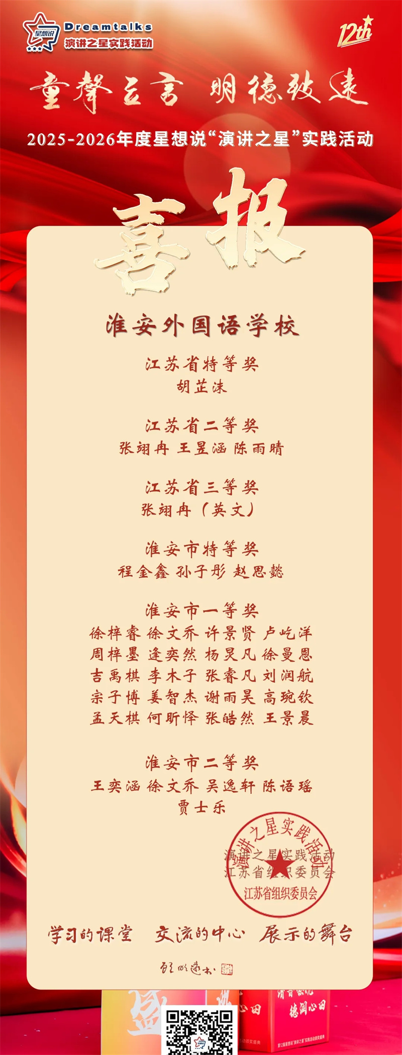 近日,江苏省第十二届“星想说”“演讲之星”实践活动圆满落幕,赛事结果正式揭晓。淮安外国语学校学子以铿锵之声展少年风华,凭过硬实力逐梦赛场,在全省数万参赛选手中过关斩将、脱颖而出,用真挚的语言、从容的姿态书写青春荣光,生动诠释“童声立言,明德致远”的活动宗旨,淋漓尽致展现出淮外学子卓越的综合素养与昂扬向上的精神风貌。