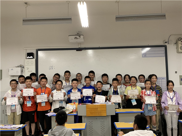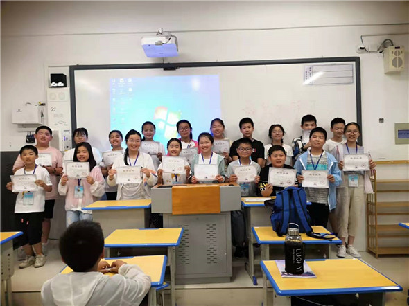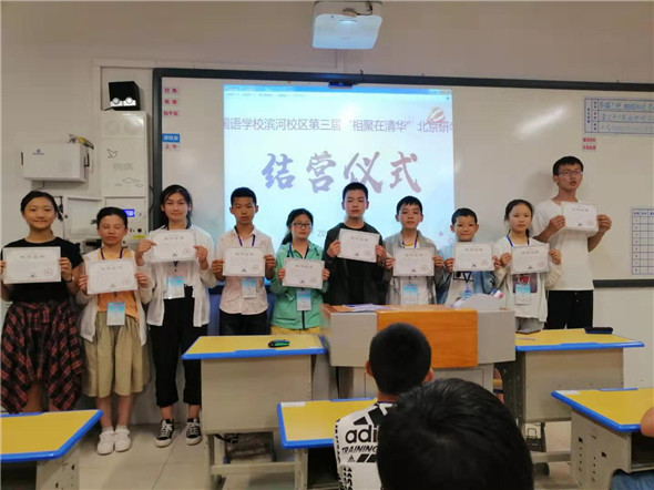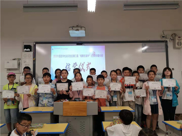 晚上八点钟,滨河淮外“相聚清华”北京研学夏令营的孩子们陆续抵达学校,各营以班级为单位,举行了“结营仪式”。带队老师对学生们的表现给予了充分的肯定,并为在各方面表现突出的同学颁发了荣誉证书。