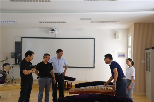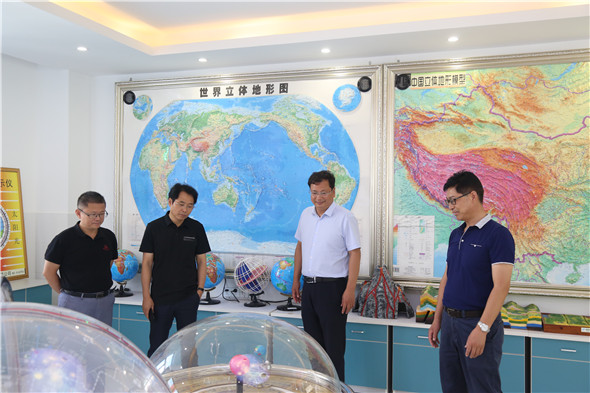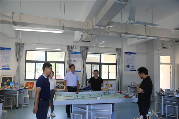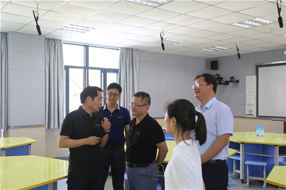 在初中部校园的金地球广场,卢总校长向来宾介绍了翔宇教育集团的办学宗旨和育人目标,并带领来宾参观了立足学生多元发展而设立的创客中心、钢琴教室、古筝教室、录播教室、史地教室、书法教室、美术教室等个性化功能教室。