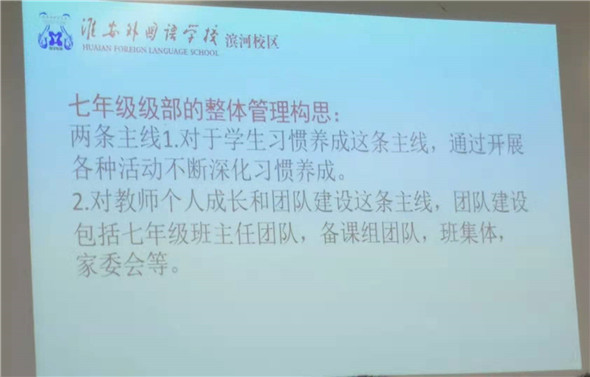 好的开始是成功的一半,全体初一级部老师已经统一思想,他们将以饱满的姿态迎接新的学期,让鲜花和掌声永远与滨河淮外相伴。