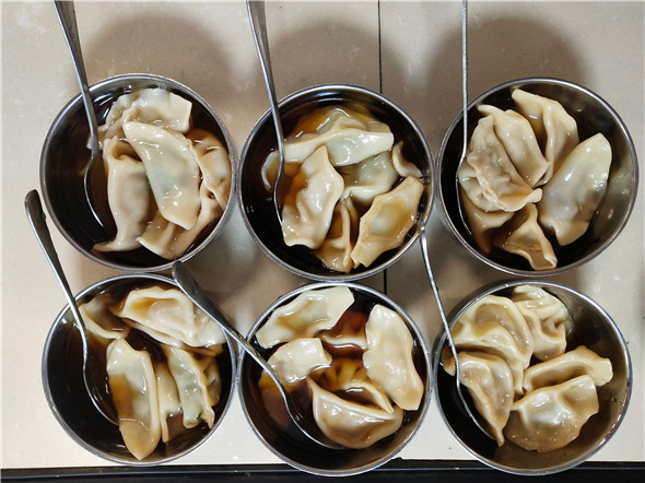 营长们拿着托盘把同学们包好的饺子送到后厨,食堂的叔叔阿姨们为营员们煮好了饺子,并把饺子分装在调好汤汁的碗里,营员们在焦急的等待中终于迎来了美味的饺子。