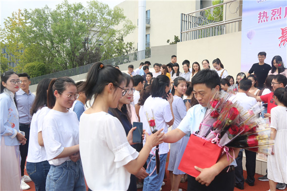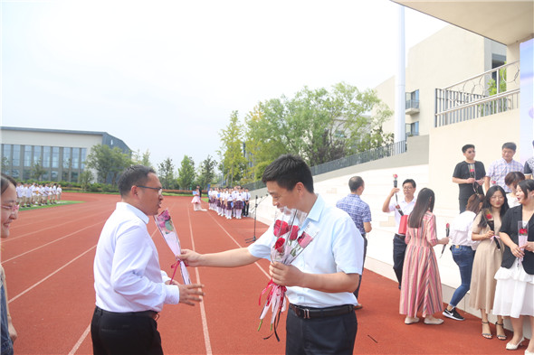 淮安外国语学校常务校长赵树青、常务副校长田学银,为我校所有老师赠送玫瑰,祝愿老师们节日快乐!老师们纷纷走到主席台前,合影留念。会场气氛十分温馨有爱,今天的滨河淮外是欢乐的海洋。