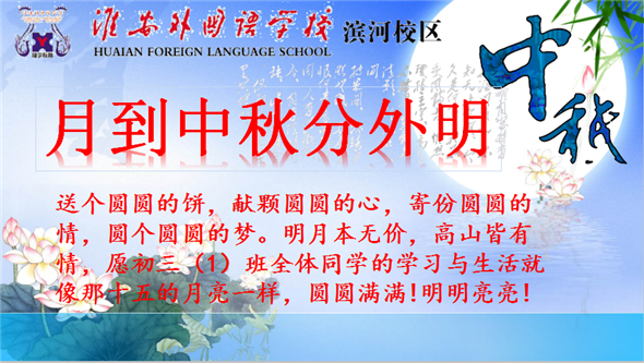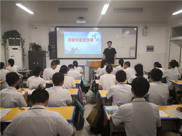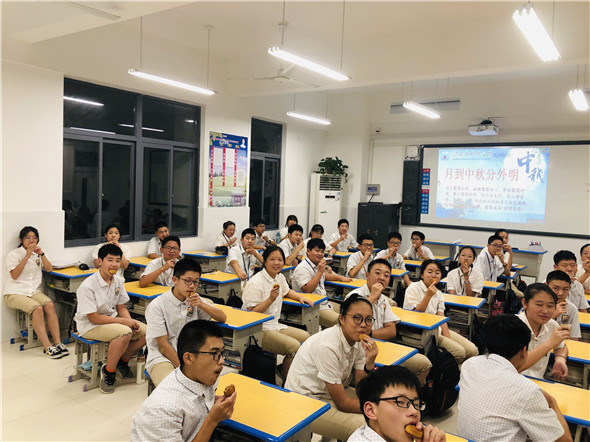 “海上生明月,天涯共此时”。晚上7点整,各班开始进行班会,班主任老师与同学们一起了解中秋节的习俗及由来。在班会过程中,同学们分享自己在中秋节里那些难忘的温馨时刻,同学之间互相致以节日的甜蜜问候……每位同学都积极参与,每一间教室里都暖意浓浓。