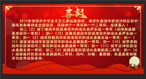 这次比赛是滨河淮外学子继去年淮安市中学生才艺大赛之后的又一次精彩展示!此次比赛六名选手分别参加了声乐、器乐、舞蹈、朗诵,全部获涟水县一等奖!其中,有五名选手代表涟水县参加淮安市中学生个人才艺大赛,并获得四个一等奖和一个二等奖。
