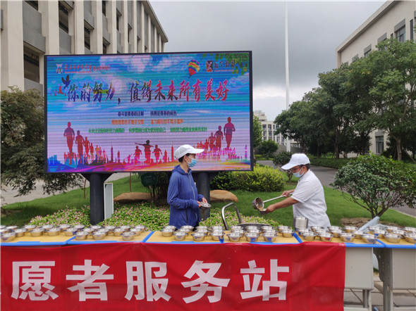 秋天的校园因为同学们的到来再次焕发生机,拖着大包小包回到学校的同学刚进校门,就看到了一辆辆爱心小车,志愿者们主动替同学们提行李,勤劳的老师们也纷纷撸起袖子上阵,让每一位同学都能轻轻松松的走进校园,轻轻松松的开始学习。除了爱心小车,志愿者服务站的清凉解暑的绿豆汤也让每一位同学为之驻足,一碗碗绿豆汤,喝在嘴里,甜在心里,志愿者和食堂的阿姨在旁边打满一碗一碗绿豆汤放在桌子上,成为了这个校园里一道亮丽的风景线。