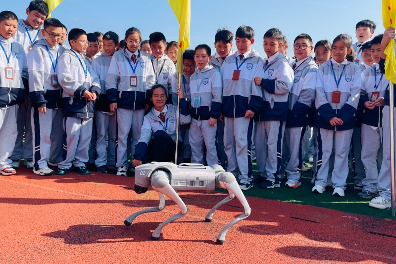 活动当日,校园化身为充满未来感的“科技乐园”。空中,无人机编队时而如雁阵般整齐划一,时而如精灵般灵动穿梭,进行着高难度的飞行表演,引来阵阵喝彩。地面上,四足机器狗稳健登场,它不仅能行走、奔跑、作揖,更能智能避障、执行指令,其仿生姿态与强大功能,让同学们惊叹不已。