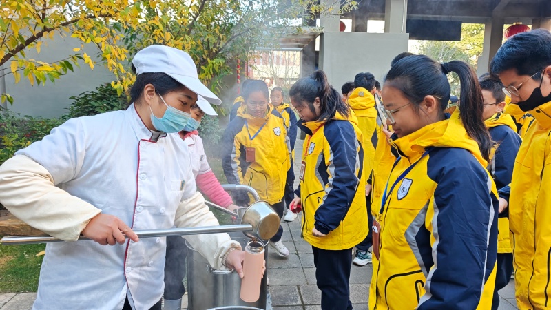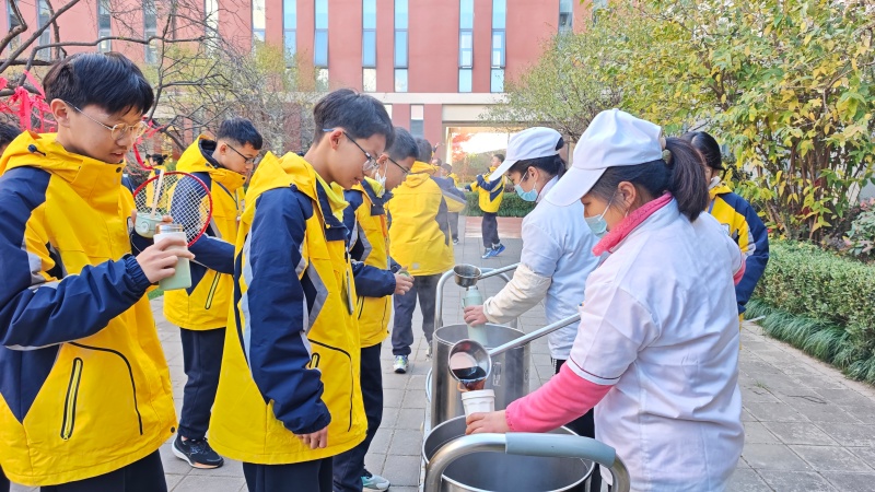教学楼入口处,院落里,保温桶中深琥珀色的茶汤正微微沸腾,氤氲的白雾裹挟着生姜的辛香与红糖的甘醇,在清冽的空气里划开一道道温暖的轨迹。