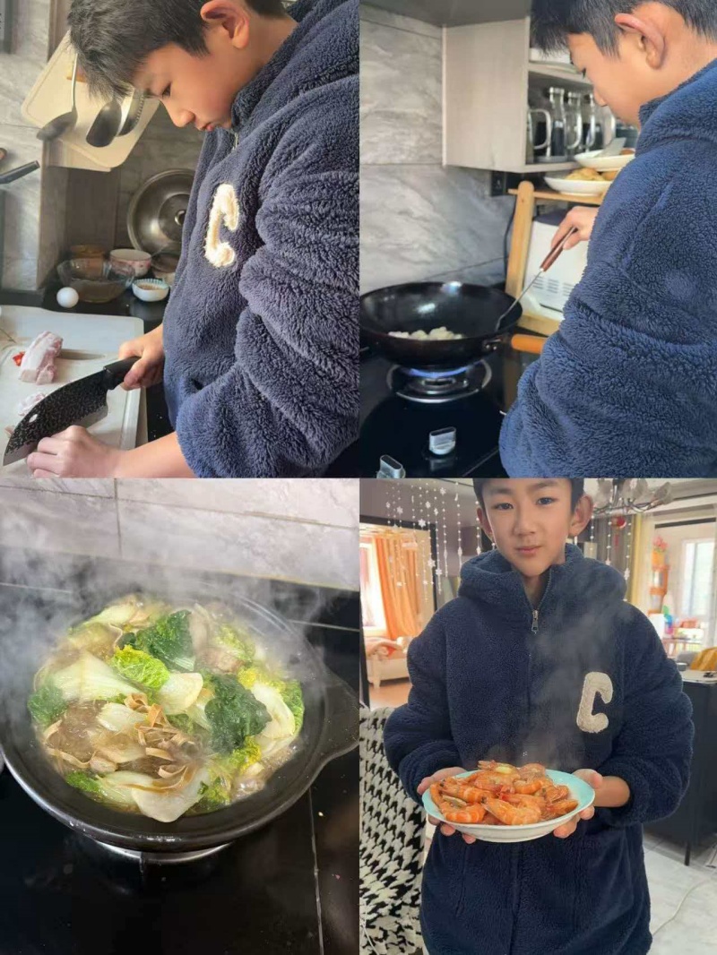 “我为家人做道菜”成为这个假期最具烟火气的挑战。同学们从食谱学习、食材采购到清洗烹饪,独立或是在家人指导下完成。厨房里虽偶有“手忙脚乱”,但端上桌的菜肴无论味道,都饱含着浓浓的心意。初一级部的学生在自己的努力下做出了一道道丰盛的菜肴,同学们表示:“看到爸爸妈妈吃的时候开心的笑容,特别有成就感,也明白了日常三餐的来之不易。”此外,参与家庭大扫除、整理个人空间等劳动,也让同学们在挥洒汗水中增强了自理能力和家庭责任感。