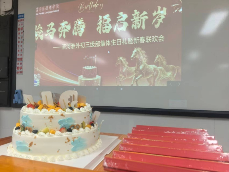 新春将至,校园暖意融融。2月5日晚上,滨河淮外初三级部为1月、2月过生日的同学举办了一场以“骏马奔腾,福启心岁”为主题的集体生日会,在忙碌的初三生活中,为学子们注入了一份温馨难忘的激励。