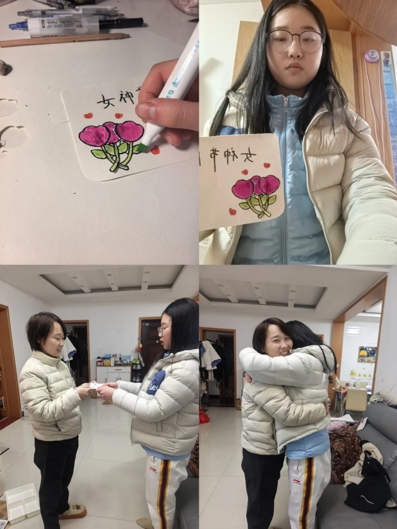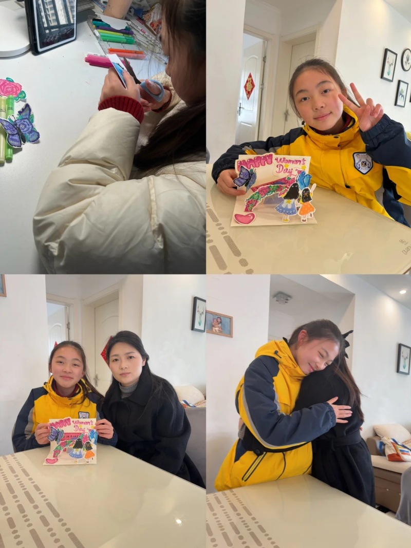 学校还组织学生开展“巧手送祝福”活动,同学们或动手做礼物、或精心绘制贺卡,或制作手工发簪、编织挂饰……将浓浓爱意融入一份份手工作品当中,用自己的双手为妈妈、奶奶、外婆送上最真挚的节日礼物。一位妈妈感动地说:“孩子的手作虽然简单,却是最珍贵的礼物,让我感受到了满满的幸福与感动。”