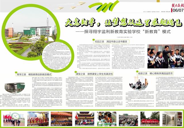 细致了解,充分挖掘,深度解读。7月6日,《楚天民报》记者曹向阳、钱婷,学校通讯员高谋,撰文《大鸾翔宇,让梦想从这里展翅腾飞》——探寻监利新教育实验学校“新教育”模式。该报用2个版面,5400多文字,10几张照片,从美丽校园,精致管理,课堂改革,辉煌业绩等4个方面图文并茂地报道了学校践行“新教育”的六大行动,尤其是在营造书香校园、聆听窗外声音、构筑理想课堂等方面学校的发展历程与办学特色。全面展示了监利新教育实验学校不平凡的发展之路与奇迹般的发展成就。
