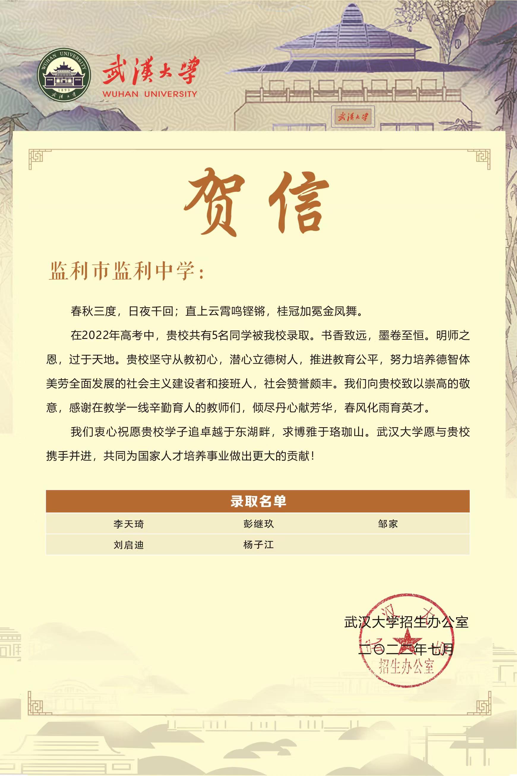 ¡¡¡¡½üÈÕ£¬Î人´óѧ¡¢»ªÖÐʦ·¶´óѧËÍÀ´Ï²±¨£¬ÈÈÁÒ×£ºØ¼àÀûÖÐѧÀîÌìçù¡¢Åí¼Ì¾Á¡¢×Þ¼Ò¡¢ÁõÆôµÏ¡¢Ñî×Ó½µÈ5λͬѧÒÔÓÅÒì³É¼¨±»Î人´óѧ¼ȡ£¬ÖܾÅÈç¡¢³Â¾ê¡¢ÄÂÔó¶÷¡¢Ô¬Óù㡢ÅËÓêÏ£¡¢ÕŽݡ¢À³¿¡¢½ÐÀâù¡¢Ô¬Çç¡¢Àî˼ͮ¡¢ÀîºÆÓ±µÈ11λͬѧÒÔÓÅÒì³É¼¨±»»ªÖÐʦ·¶´óѧ¼ȡ¡£Ô¸¼àÀûÖÐѧ½ÌÓý°Ù³ß¸ÍÍ·¸ü½øÒ»²½£¬Ô¸¸ü¶à¼àÖÐÓÅÐãѧ×ӵǿƼ°µÚ£¡