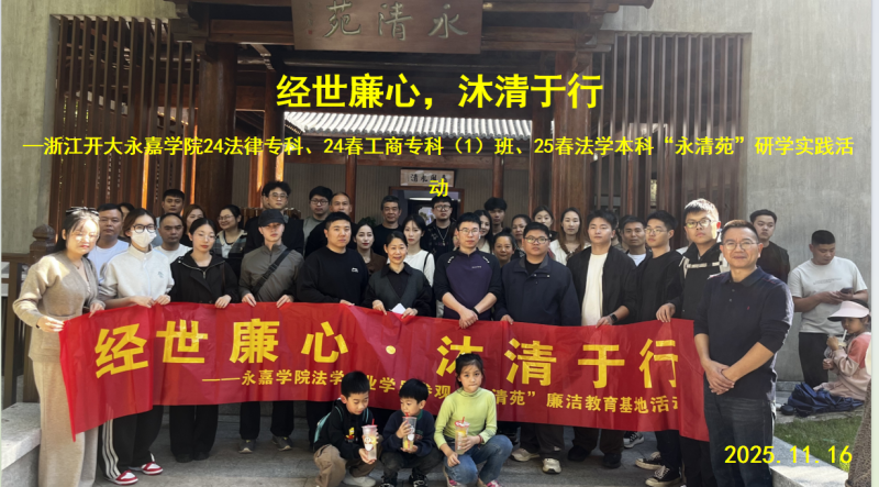 时间:2025-11-18 14:45:48 浏览:15111月16日下午,浙江开放大学永嘉学院组织法学与工商企业管理两个专业共50余名师生,前往“永清苑”廉洁文化教育基地开展实践学习活动。...
