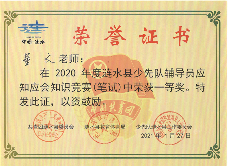 在少先队辅导员应知应会知识竞赛(笔试)中,我校陈姝和董文老师荣获一等奖,朱朝晖主任荣获二等奖