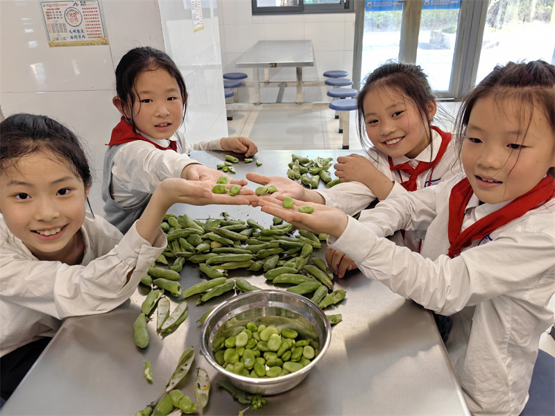 轻轻剥开豆荚,哇!原来大大的豆荚房子里住着蚕豆宝宝的一家,有的大有的小,真神奇呀!“快看,我这颗蚕豆是最大的!”“我仿佛也变成豆荚了!”剥蚕豆真好玩也真辛苦,满满一篮蚕豆都是同学们的杰作,亲手把蚕豆宝宝洗干净,这种经历真奇妙!在阵阵欢笑声中,一篮篮蚕豆剥好了,孩子们个个脸上都露出了灿烂的笑容。