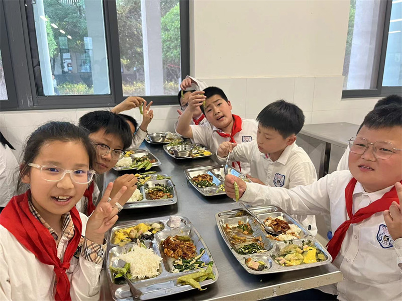 满载收获的滨河娃将今天采摘的喜悦和伙伴们进行分享,新鲜采摘的豆宝儿要如何“变身”呢,一起跟着餐厅的厨师叔叔制作美食吧!大家围坐在一起,品尝着鲜美的豌豆与蚕豆,脸上洋溢着满足和快乐。