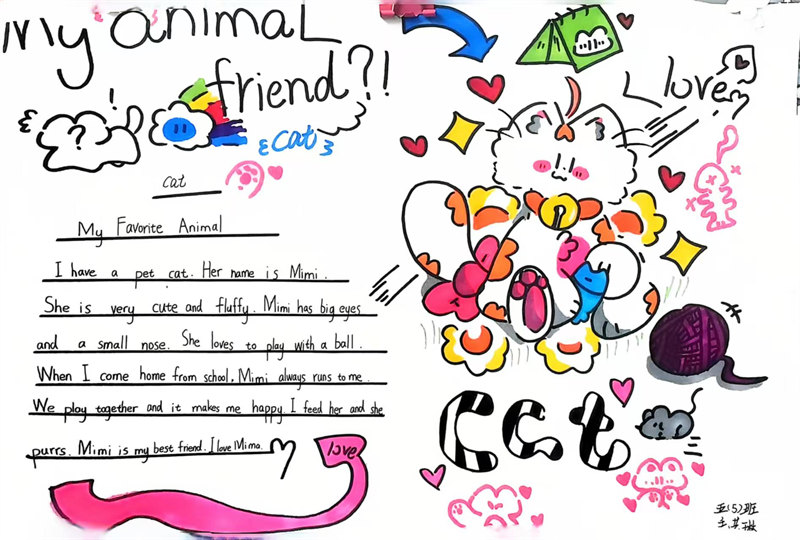 他们用自己的小手描绘了英语学习的快乐。瞧,一张张图文并茂、充满童趣的动物手抄报在学生们的手中诞生。憨厚的熊猫,可爱的小猫,亲人的仓鼠……让我们一起欣赏学生们精心设计的作品吧!
