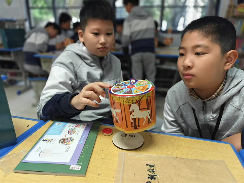 学生先动手制作了跑马灯的木制底座,紧接着制作了跑马灯的笼壁,笼壁是由多个五彩缤纷的图片组成,跑马灯在转动时就犹如真的有马在跑动,随后学生们制作了骨架并进行了组装,组装完成后,点燃底部的蜡烛,随着热空气上升,跑马灯逐渐转动,撬动了学生探索更多奥秘的兴趣。