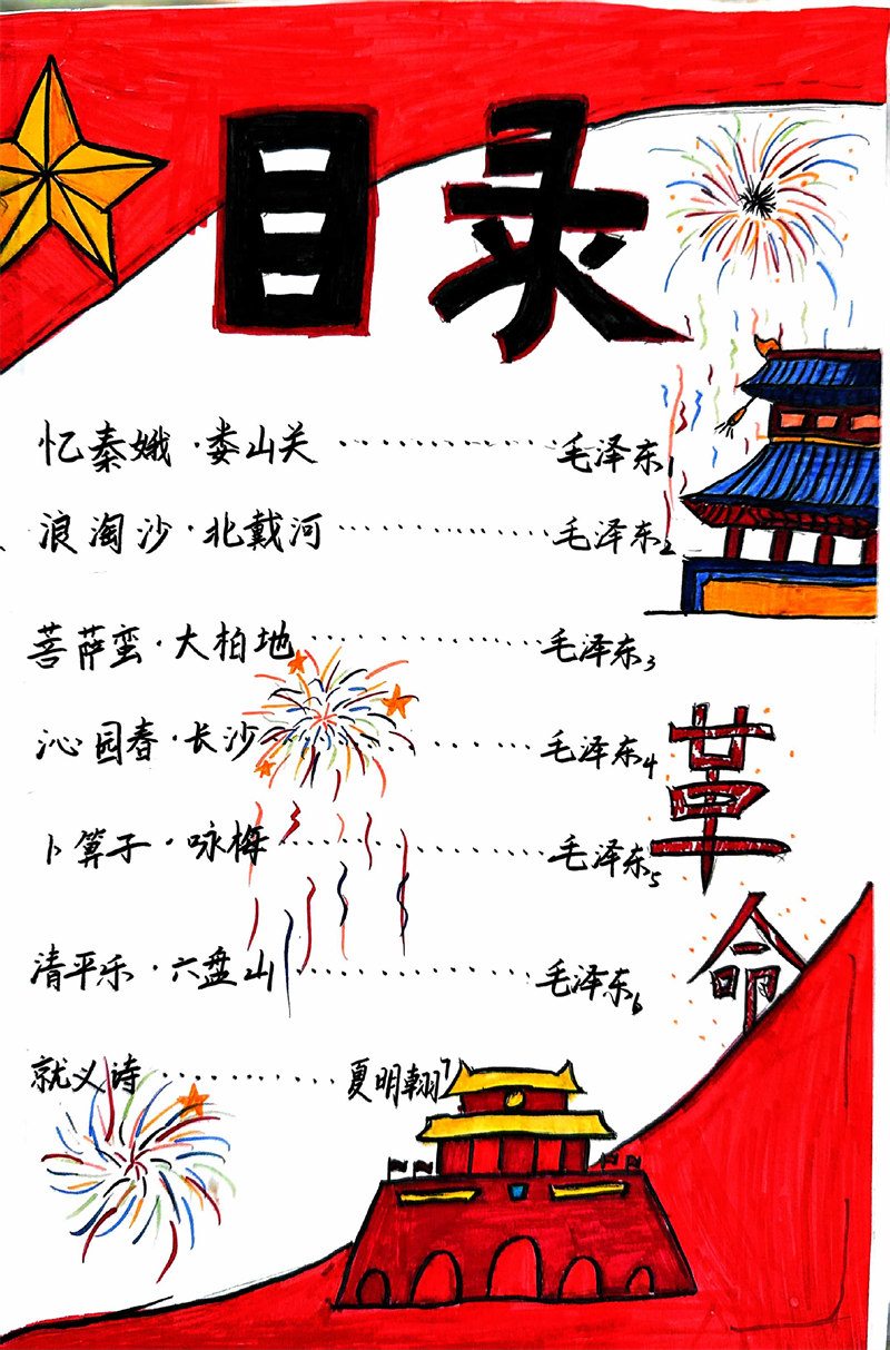同学们小组合作,明确分工。从搜集诗词,到整理分类,再到誊抄诗词、绘制插图,每一步都事无巨细;从封面的设计绘制,到目录的编排,再到装订成册,每个细节都有条不紊。同学们团结合作,大展身手,将内心对红色文化的崇敬换化成一本本可视可触的小诗集。