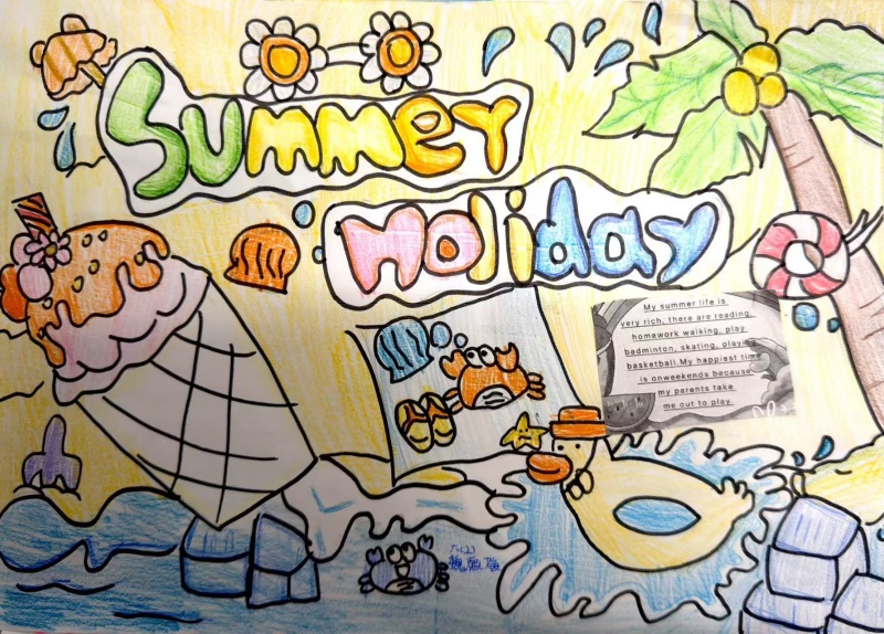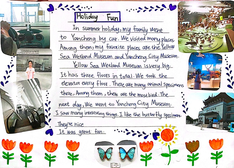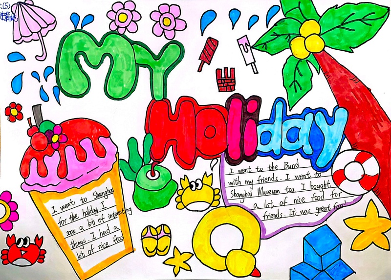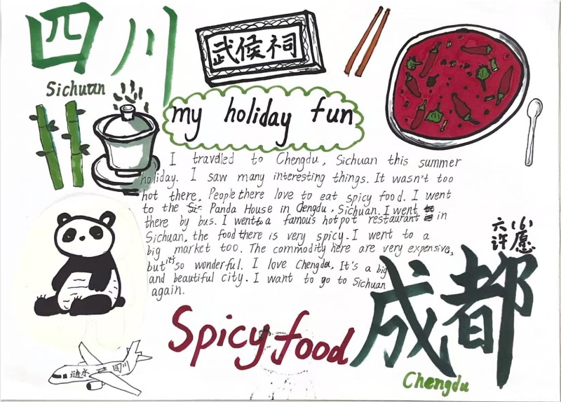 同学们化身“小小旅行家”与“创意设计师”,围绕“Holiday fun”展开创作。手抄报内容丰富多元,同学们有的以“有趣的城市”为主题,用英文介绍祖国的名胜古迹,搭配精准的词汇与生动的插图;有的聚焦“家乡的美景胜地”,用流畅的英文描述本地的自然风光与文化特色,传递对家乡的热爱。
