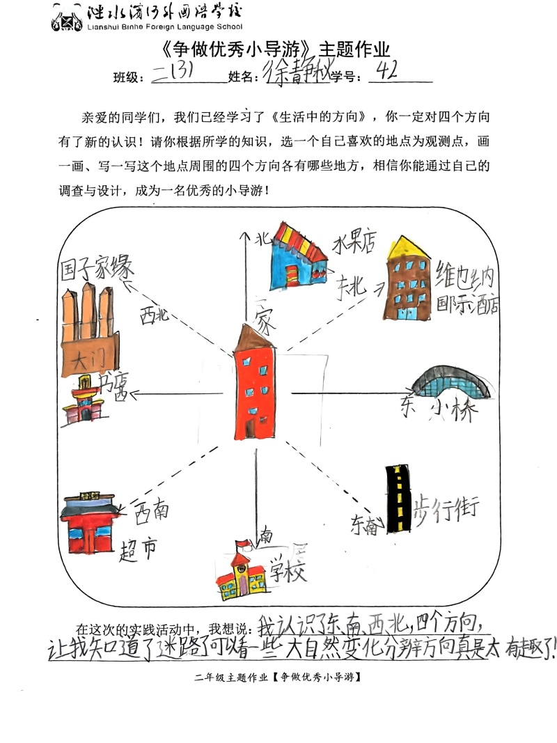 学生首先选取自己喜欢的地点作为观测点,通过画图、文字记录的方式,梳理该地点东、南、西、北四个方向的周边场所。从家到小区花园,学生们纷纷化身“小小观察员”,用脚步丈量身边的空间,用画笔和文字记录方向与场景的对应关系。