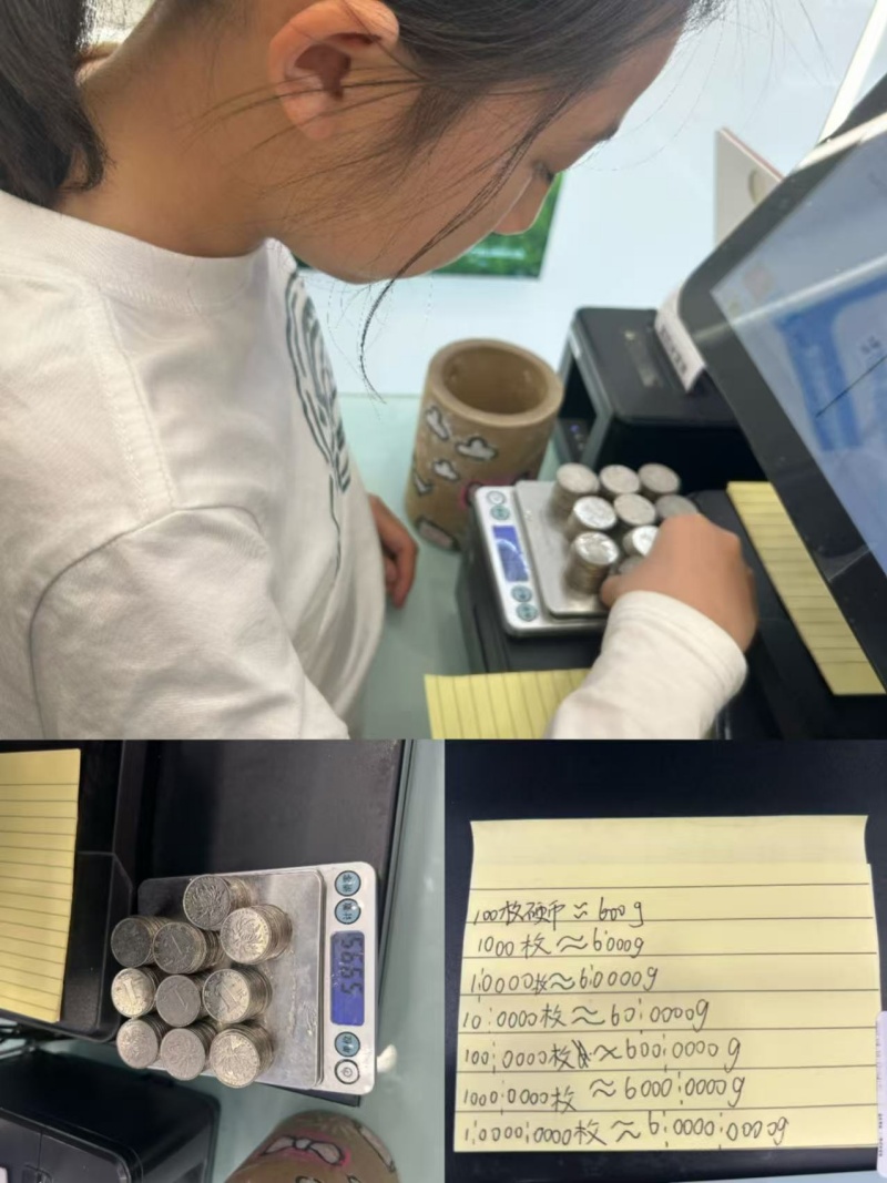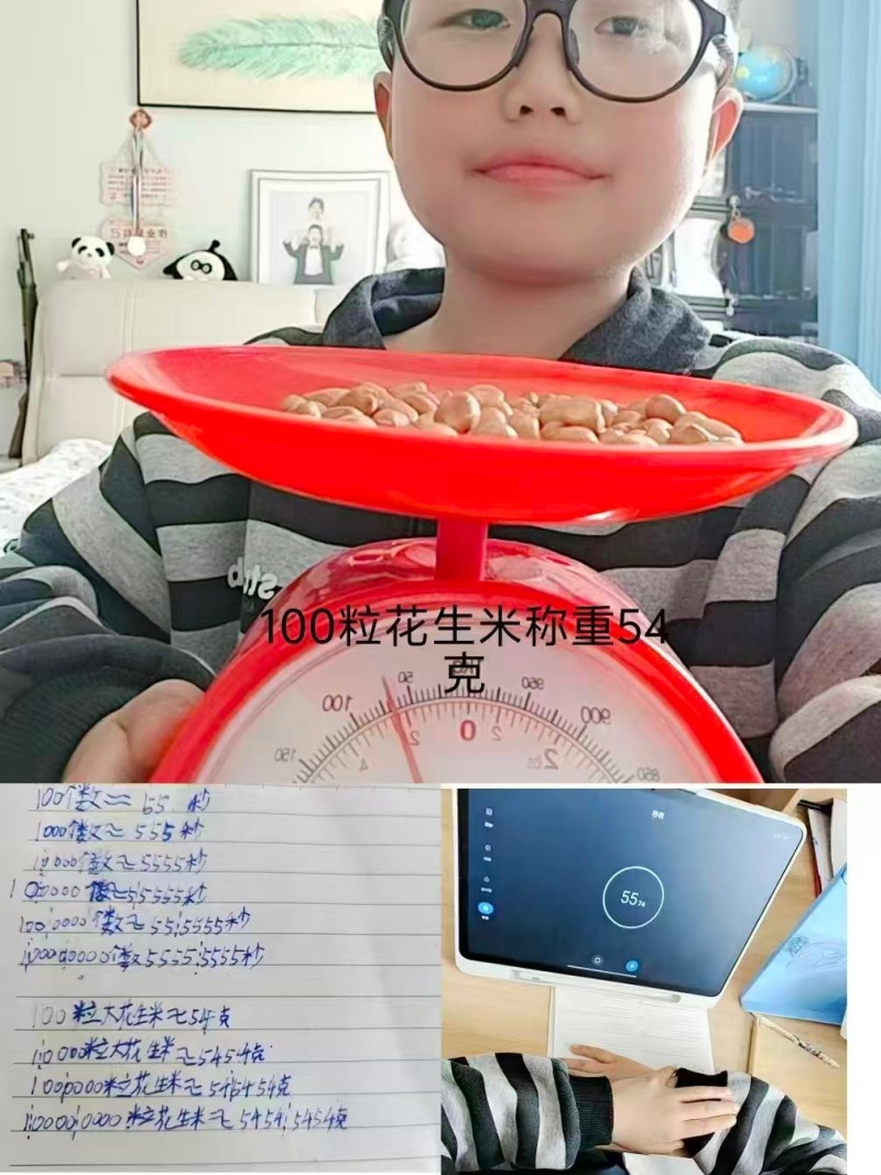 活动过程中,同学们化身小小数学家,分工协作、有条不紊。大家先通过数一数、量一量、称一称、算一算的方式,精准测量出10张纸、100粒米、1枚硬币的基础数据,再通过严谨的数学推算,一步步得出一亿张纸的厚度、一亿粒米的重量、一亿枚硬币叠放的高度。