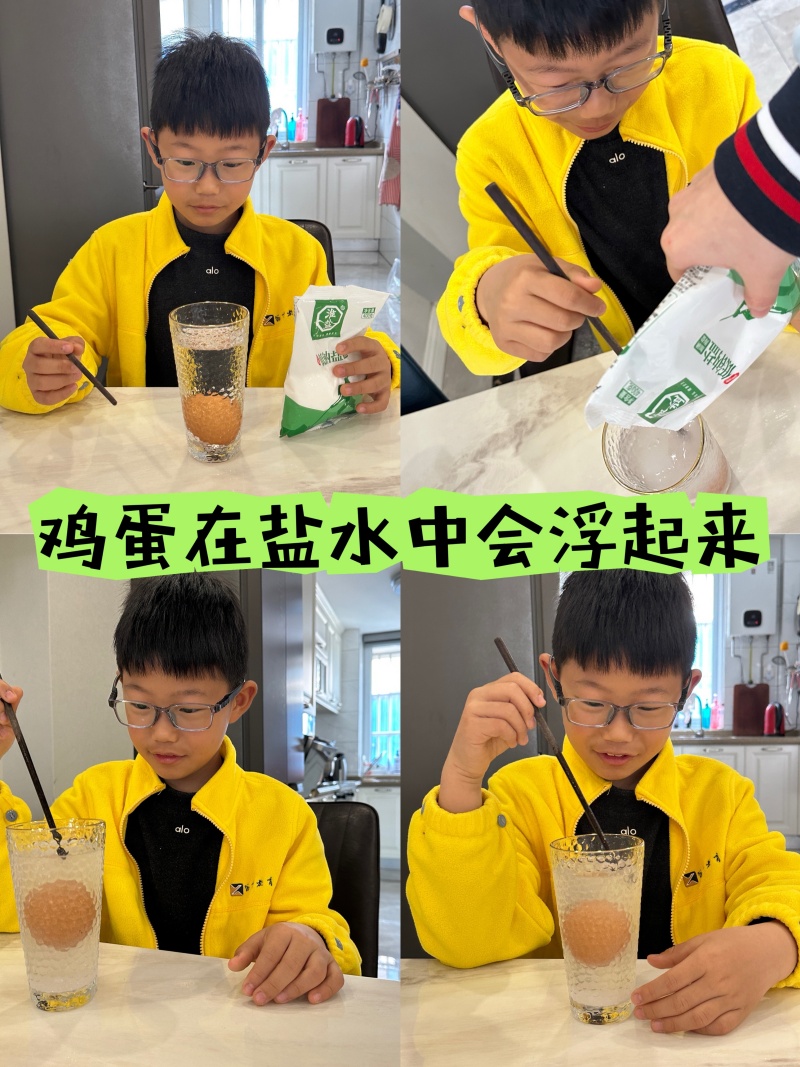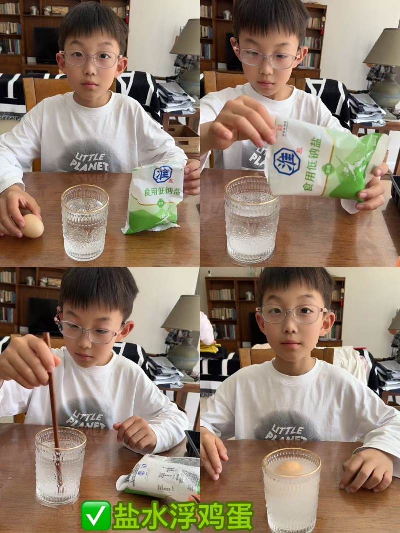 油彩轻轻滴落水中,再撒上几粒细盐,水底瞬间绽放出绚烂的烟花,油滴缓缓下沉、扩散、旋转,静谧而华丽。小苏打与白醋悄悄“对话”,气球在瓶口自己鼓了起来,从干瘪到圆滚滚,仿佛瓶子真的有了呼吸。清水中的鸡蛋原本沉在杯底,随着一勺勺盐的加入,它竟慢慢升起,悠闲地浮在水面上——盐水托起的,不只是一枚鸡蛋,更是对密度世界的好奇与向往。