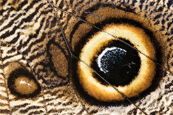 猫头鹰环蝶的名字来源 于它们翅膀上的图案,在它们下层的两侧翅膀上,分别有一处像猫头鹰眼睛一样的图案,看起来有点凶神恶煞。这是一种警戒色,猫头鹰眼睛图案的功能就是在欺骗捕食者,让对方误认为正有一只大眼睛动物在凶狠地瞪着它们。