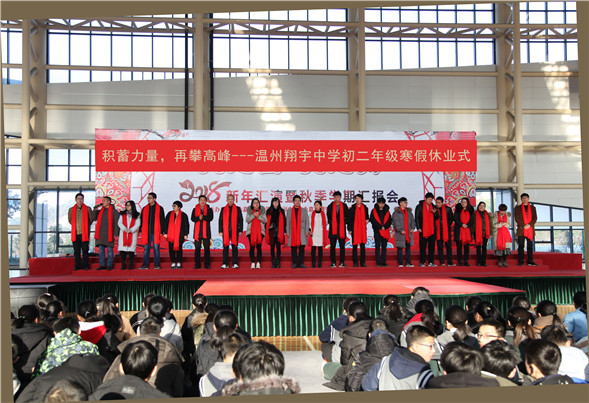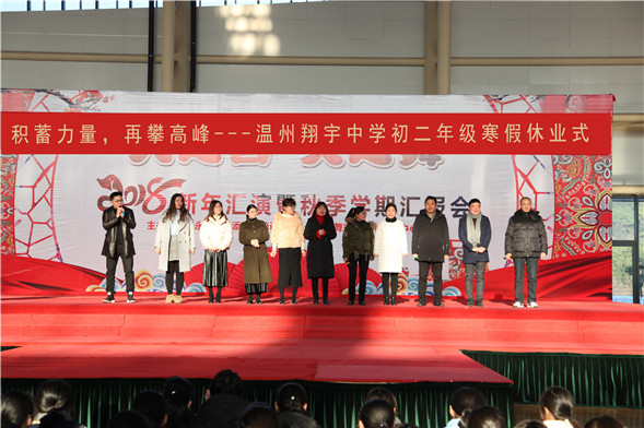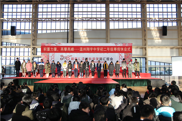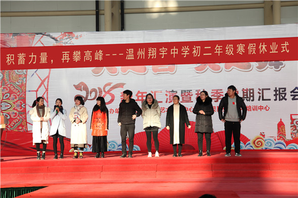 2018年2月5日,温州翔宇初二年级全体师生在学校体育馆举行了休业式。仪式上,不仅有各学科老师代表为同学们提出相关寒假复习指导,还有全体老师以学科为单位向同学们拜早年,预祝同学们在寒假里玩得开心,享受家庭的温暖。