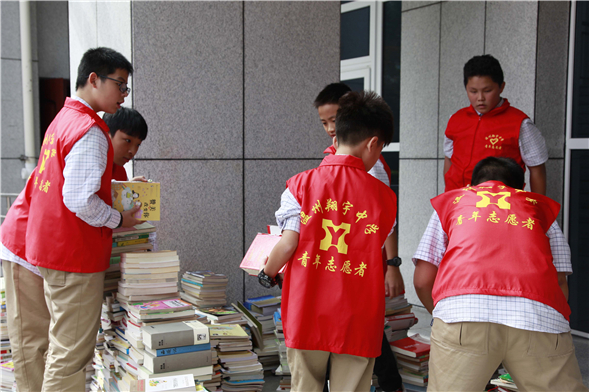 “没什么特别的,就是有许多看过的书,正好有人需要就捐了。”学部语文老师龚斌待孩子们完成捐赠后,默默地将书一堆书送给志愿者们。“与人分享,在能力范围内给予他人帮助原来可以如此快乐。”当天的学生志愿者认真整理书籍,期待书屋建好后去实地看看,与当地的孩子开展更多的联谊活动,传爱心,共悦读。