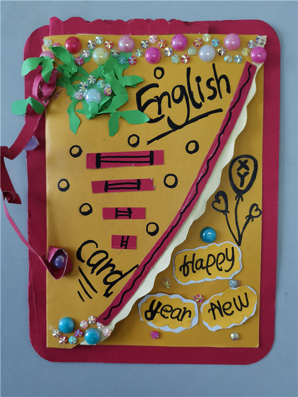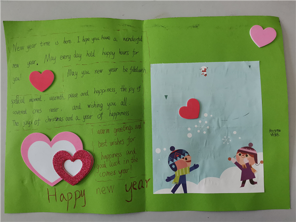 “新年收到一张精美的贺卡是一件令人感到美好又幸福的事情。”英语老师吴海静介绍,七年级学生由于年级较小,英语知识储备有限,所以开展了对英语知识要求较低的贺卡设计大赛,鼓励他们利用图画和颜色,穿插英语单词和简单的句式来表达美好的祝福,旨在引导学生在参与过程中逐渐感受到英语的魅力,也让英语学习更加贴近生活。
