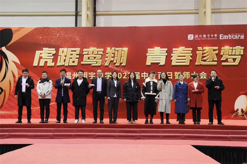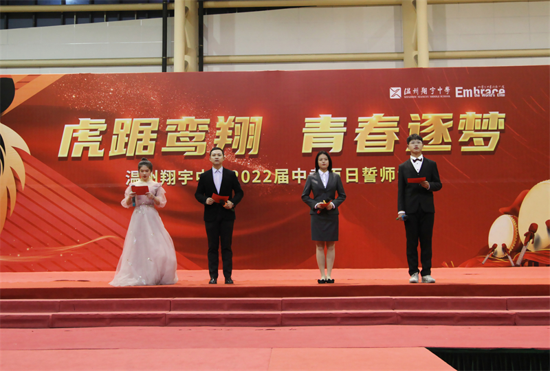 2022年3月7日晚上,温州翔宇中学初中部九年级全体师生齐聚学校陆坚运动馆,隆重举行“虎踞鸾翔,青春逐梦”中考百日誓师活动。学校党支部书记、学部校长戚成林,学部常务副校长吴志俊,学部副校长王灌南、刘月娥,学部校长助理石义刚等领导出席活动。活动由九年级(7)班刘怡婕同学、九年级(19)班徐铜银同学、王冰冰老师、胡阁老师联袂主持。