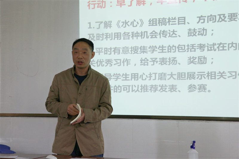 会议伊始,师生作文随笔选《水心》编辑王民老师为老师们讲析投稿稿件的常见问题,以案例分析的方式从语法逻辑、中心立意、篇幅构思、修改升格、点评示范等方面给老师们提出建议。