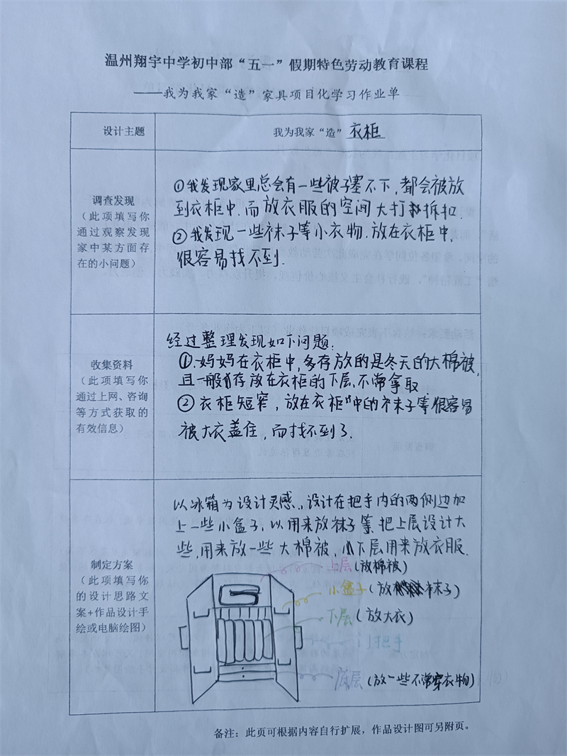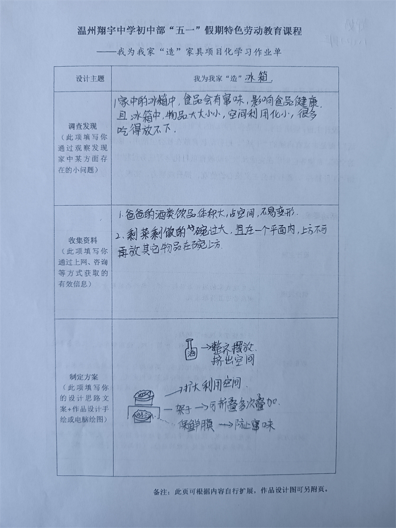 五一假期宅家,正是参与劳动的大好时机。劳动不应理解为单纯的“干活”,而是丰富有内涵的“干活”。2022年5月1日,温州翔宇中学初中部面向全体学生布置了一个劳动主题项目化实践作业,利用宅家的机会,观察家中某方面存在的小问题,并通过上网、咨询等方式思考解决办法,并将其设计思路通过手绘呈现出来。