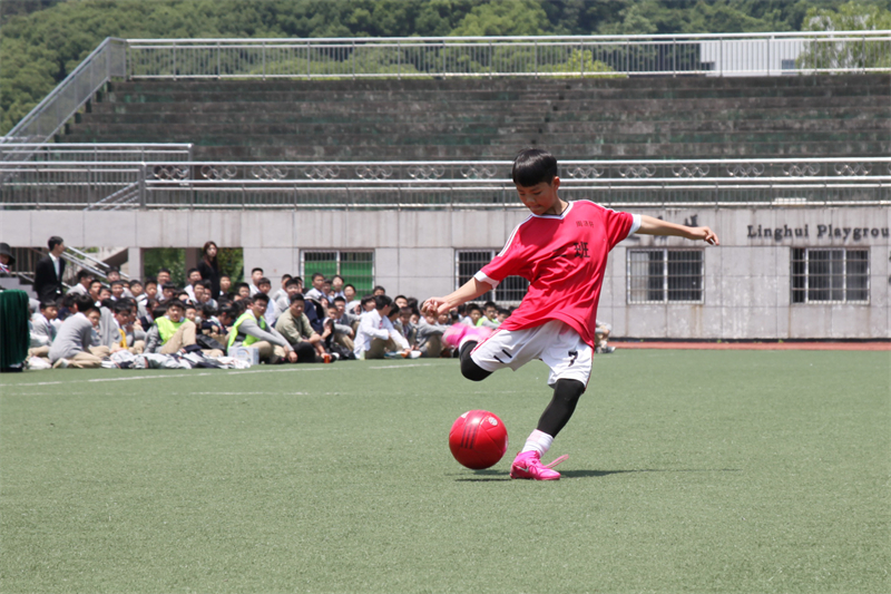 本次比赛采取8人制,分上下半场,每半场15分钟。比赛由毕业于浙江大学、亚足联C级教练员、足球二级运动员、初中部足球女队教练员池有达老师和亚足联C级教练、国家二级运动员、初中部足球男队教练员徐强政老师联手担任裁判。初中部德育处主任助理王健担任现场解说,带领同学们用专业的角度去看球赛。