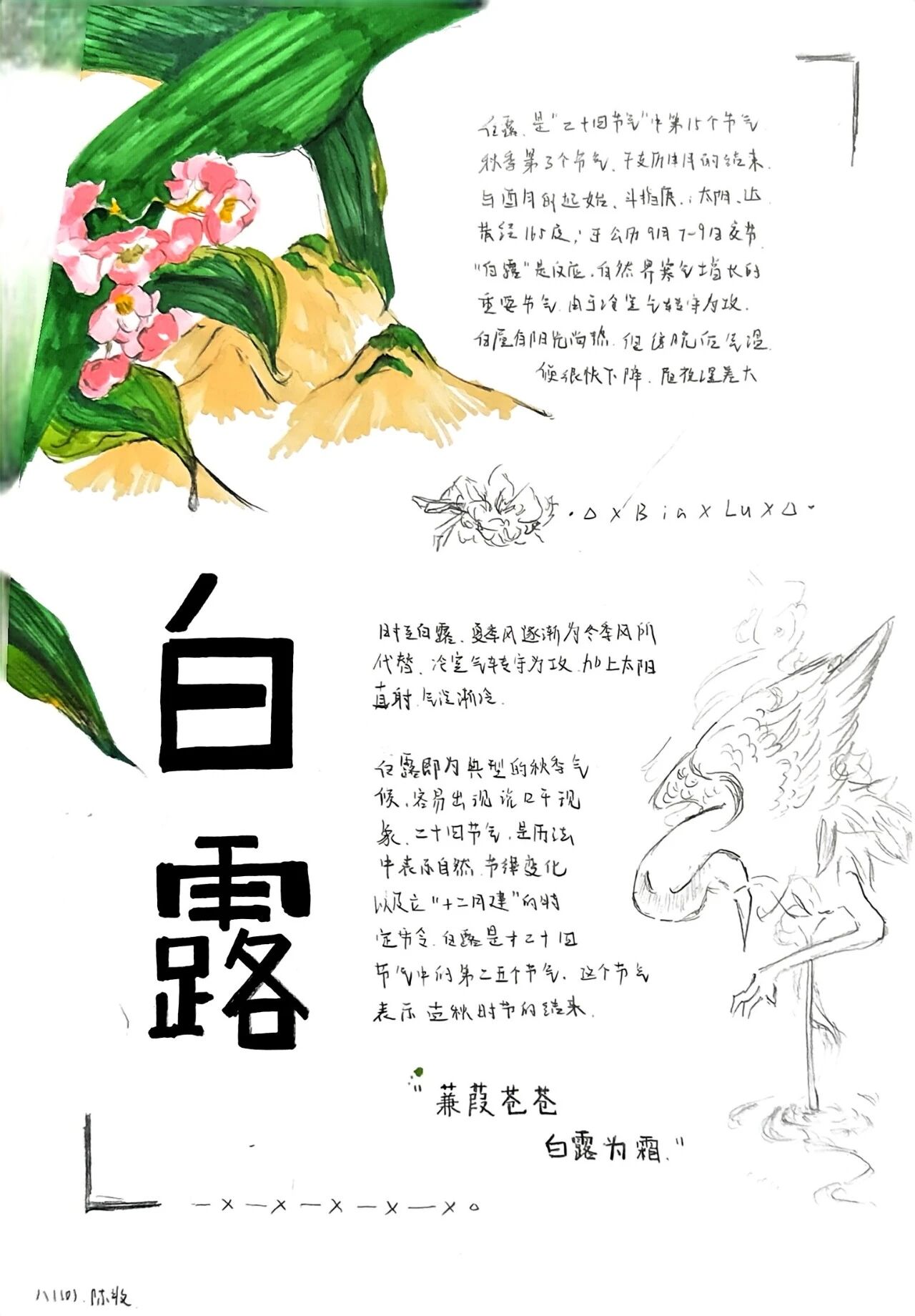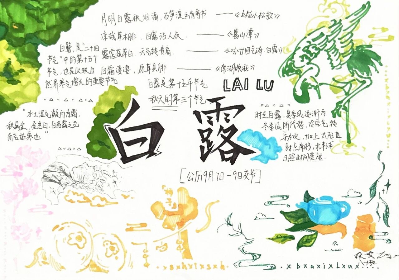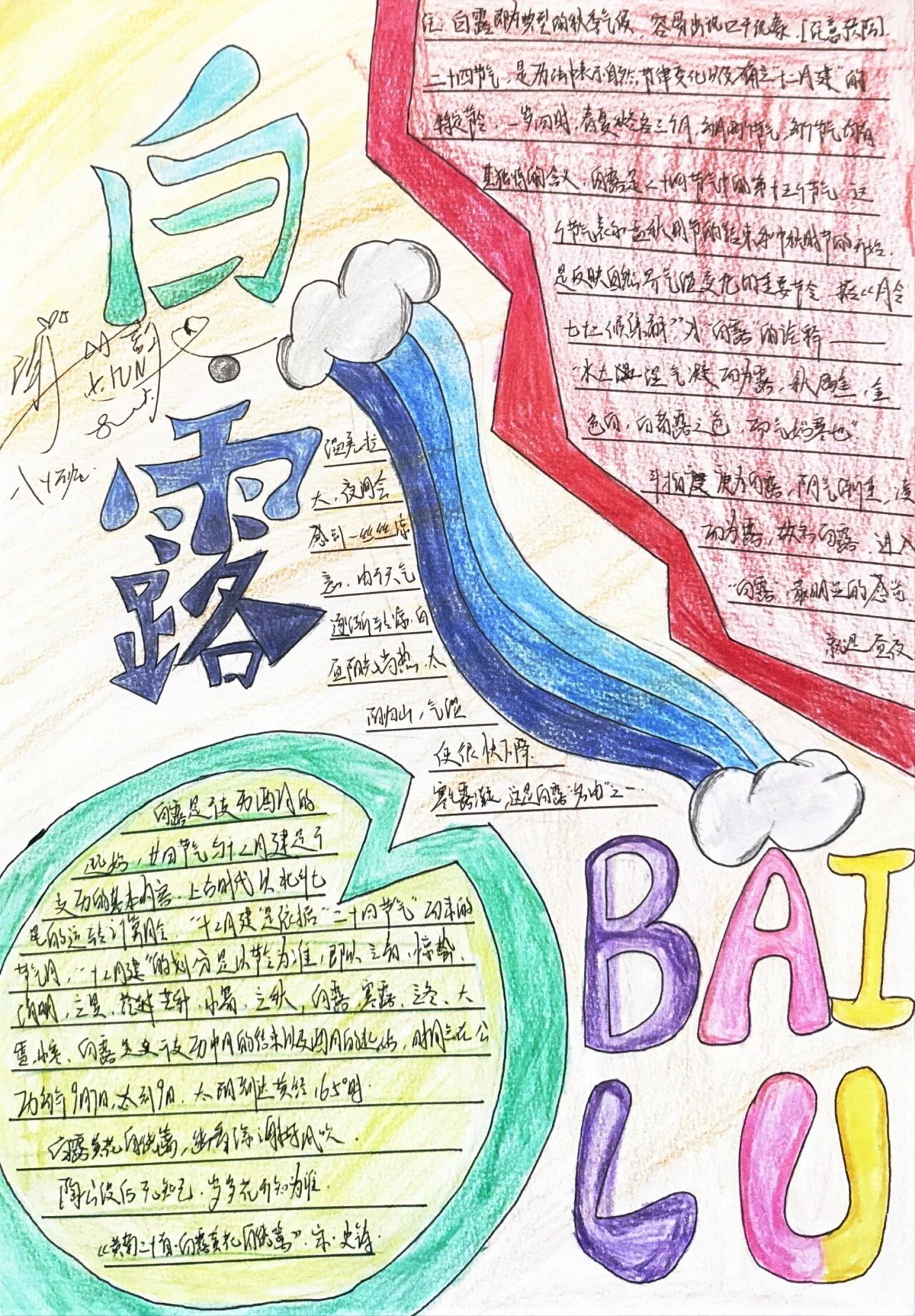 九年级10班的同学们,精心制作了一系列关于白露节气的手抄报,作品精美,既彰显了他们对白露节气的深刻理解,又展现了非凡的创造力。这些作品洋溢着浓厚的文化氛围,体现了同学们对传统文化的热情传承。