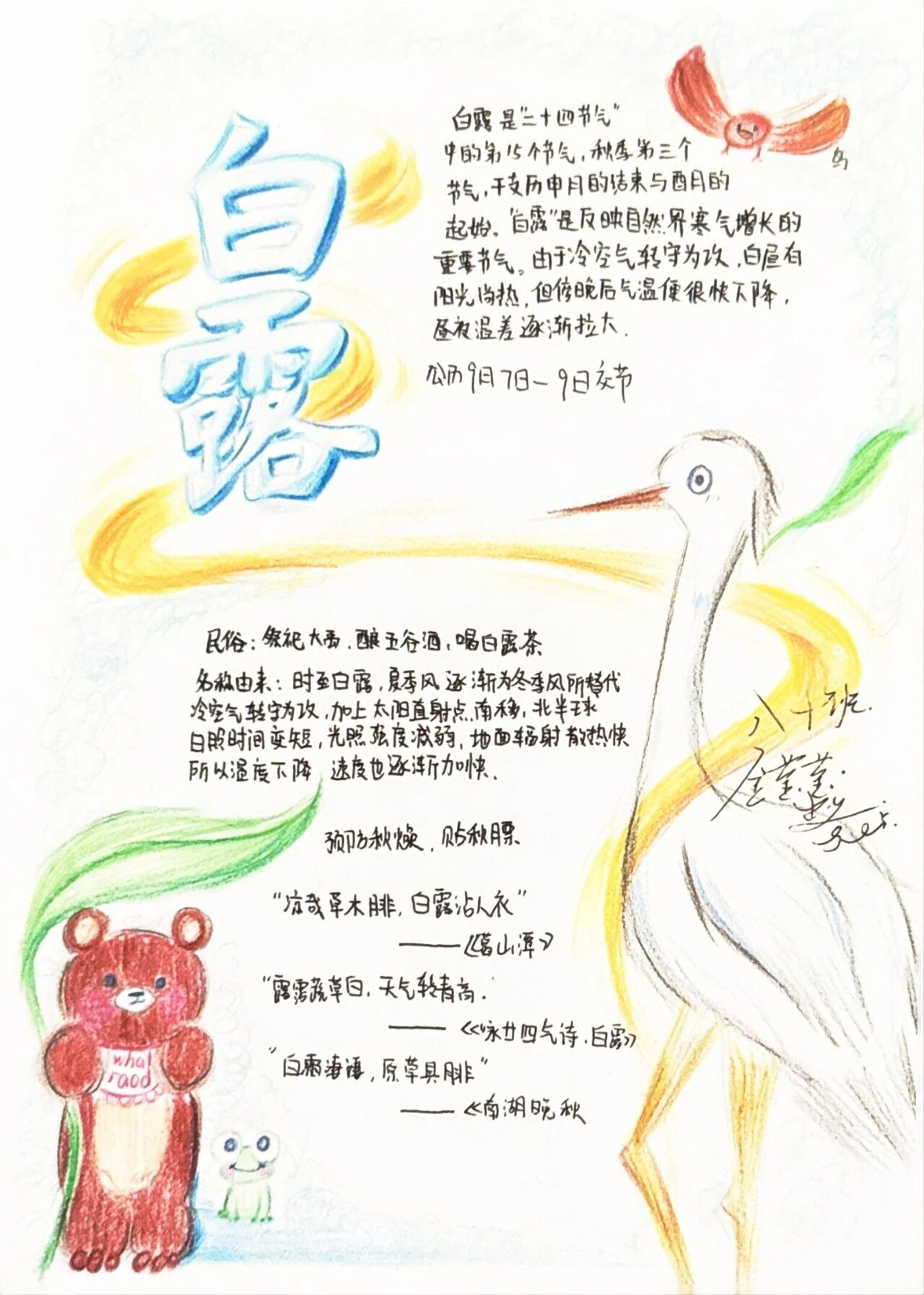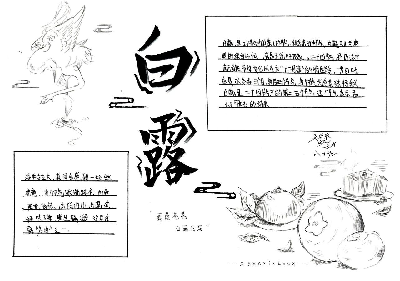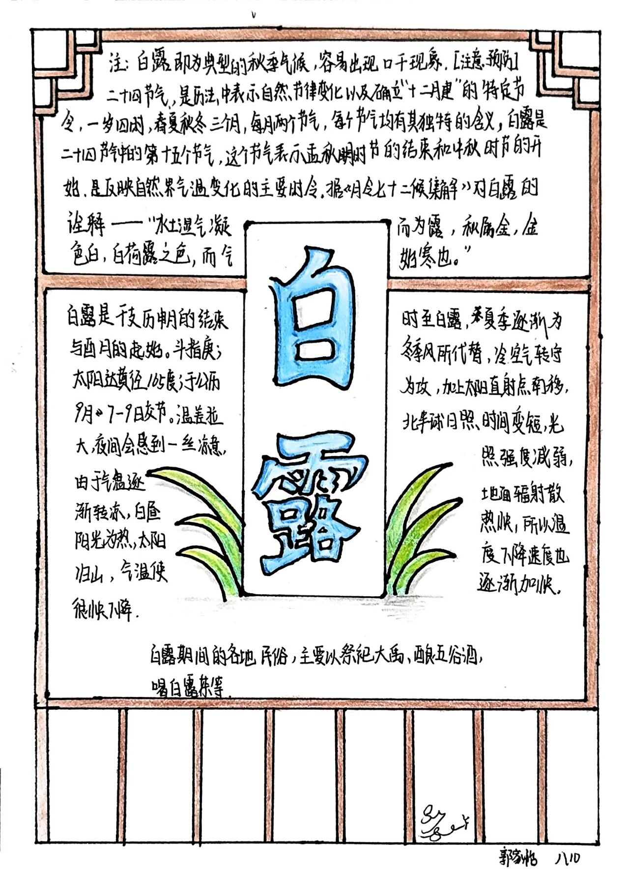 九年级10班的同学们,精心制作了一系列关于白露节气的手抄报,作品精美,既彰显了他们对白露节气的深刻理解,又展现了非凡的创造力。这些作品洋溢着浓厚的文化氛围,体现了同学们对传统文化的热情传承。