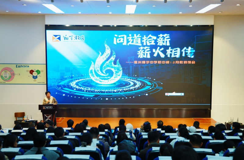 2025年12月4日晚,温州翔宇中学初中部月度例会在叶适报告厅举行。本次会议以“问道拾薪·火相传”为主题,旨在总结前期工作、表彰先进、凝聚共识。会议由初中部校办副主任王莉主持,初中部全体教师参与。