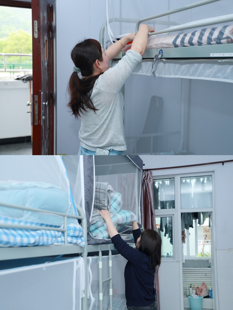 13:50,老师们准时到场集合、抽签。随着一声口令,14:00比赛正式开始——铺床单、叠被子、摆物品、清死角……老师们动作利落、有条不紊,仿佛开启了“倍速模式”。30分钟后,一间间原本“素面朝天”的宿舍变得整齐划一:被子棱角分明,洗漱用品排成一条直线,地面光可鉴人。