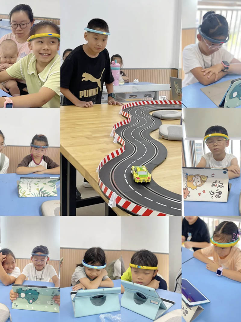 另一组同学正沉浸在人工智能的奇妙体验中,感受着前沿科技带来的澎湃活力。他们戴上特制的脑电设备,当注意力高度集中时,赛车就在赛道上飞速驰骋。脑控赛车与脑控游戏的结合,不仅让大家直观地体验到“意念控制”的神奇,更让每个人真切感受到了人工智能技术带来的无限可能与未来魅力。