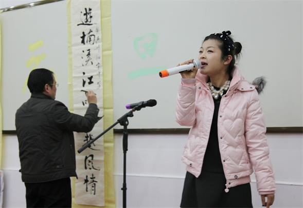 现场,初中部袁爱国、李良永、费晓东挥毫泼墨,书法助兴。“游楠溪江品南越风情,登石桅岩论天下英雄。”“翔宇永嘉”既展示书法风采,也寄寓深情祝福。李霞老师的独唱《庆祝》,吴荣奎老师的笛子演奏《纺棉花》等节目精彩纷呈。