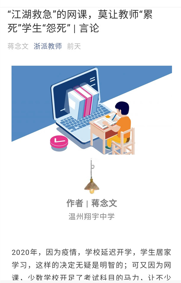 2020年3月27日,《浙江教育报》教师周刊与《浙派教师》公众号同日同时刊登温州翔宇中学蒋念文老师撰写的关于“网课”的言论文章,分别以《网课,莫让教师“累死”学生“怨死”》和《“江湖救急”的网课,莫让教师“累死”学生“怨死”》为题刊登,引起业内人士关注。蒋念文认为“离校不离教,网课让教师之爱有了新的注解”,“无论线上还是线下、面授课还是网课,学习的主体终究还是学生,教师上课都应以表扬、鼓励为主,积极培养学生的自主学习能力”。