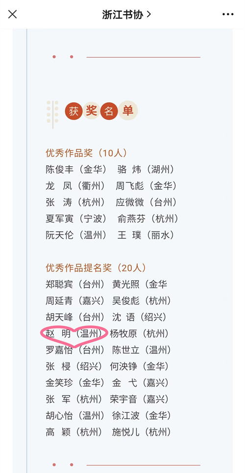 2022年9月25日,浙江省第六届“温泉杯”书法大赛评审揭晓,温州翔宇中学王羲之书法教育馆馆长赵明老师荣获优秀作品提名奖(温州市共3名)。全省共评出优秀作品10名,优秀作品提名20名。
