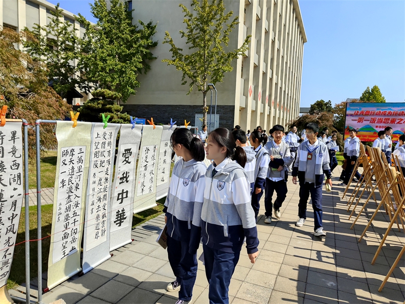 10月11日,涟水滨河外国语学校初中部开展“喜迎二十大,丹青颂祖国”书画作品展。