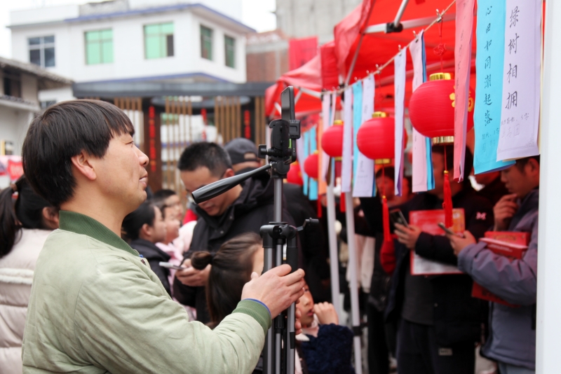 猜谜热闹场景无意间抢了集市风头,吸引当地网红直播跟进,聚焦谜条,直播群众猜灯谜盛况,一边解说一边猜灯谜,插播赵轲老师点评灯谜。两个小时不到,奖品分发完毕,乡村百姓猜谜劲头十足。
