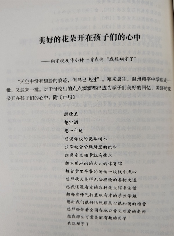翔宇毕业学生无限怀念在母校的日子,尤其怀念翔宇餐厅的味道。毕业学生作诗一首《也想》,表达“我想翔宇了”的美好感情。