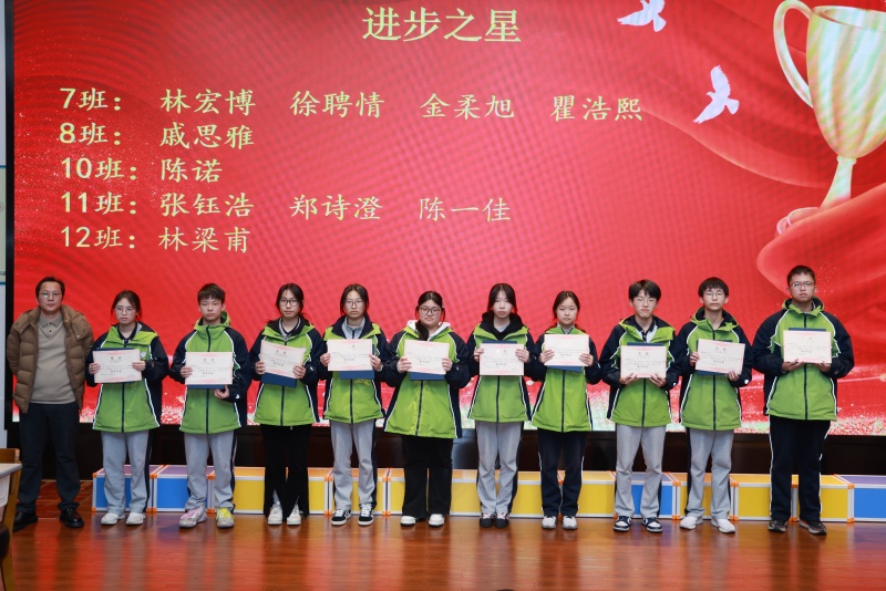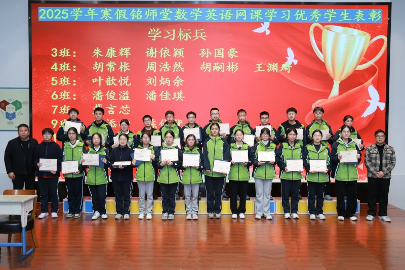 大会首先表彰了寒假学习中表现突出的优秀学生。基于铭师堂数学英语网课学习数据,依次颁发“学习标兵”“答题标兵”“笔记之星”“进步之星”四项荣誉。获奖同学以自律勤奋的态度,在假期中实现自主提升,成为年级学习的榜样。高中部校长助理兼教务处主任王乃林老师、铭师堂杨佳麟老师、教科室副主任刘金龙老师、高一年级副主任叶有彬老师、数学备课组组长原正老师、英语备课组组长刘淑倩老师等嘉宾为获奖学生颁奖。