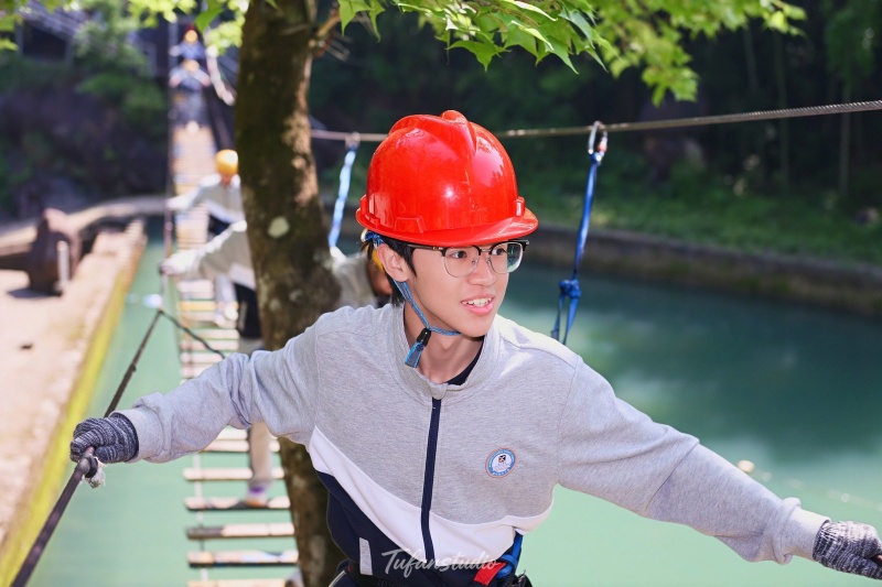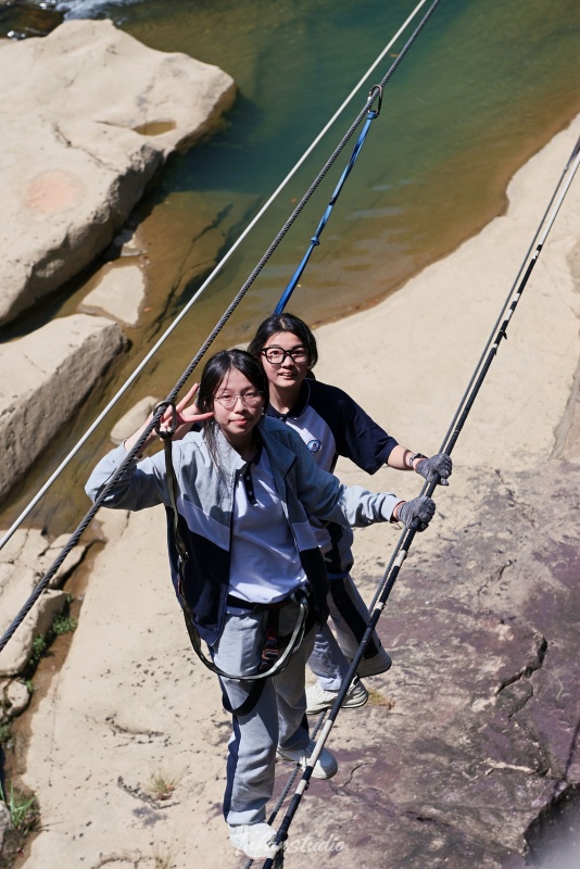 中午享用过当地特色午餐后,队伍前往【九溪欢乐谷】,开展本次活动的重头戏——峡谷穿越拓展项目。在专业教练的指导下,同学们分组进行挑战,内容涵盖峡谷栈道穿越、水上闯关、团队协作游戏等。溪谷之间,清流潺潺,同学们相互鼓励、携手前行,时而攀爬绳索,时而跨越险滩,既考验了个人的勇气与体能,更锤炼了团队的默契与凝聚力。